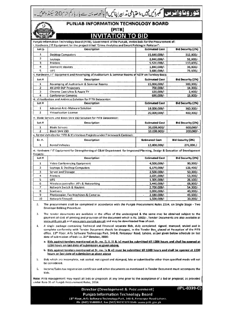 Tender Document Tender No. 5021020201PROCUREMENT OF RENTAL VEHICLES FOR PIT & ITS VARIOUS PROJECTS UNDER FRAMEWORK CONTRACT Punjab Information Technology Board (PIT) 11th Floor, Area Software Technology