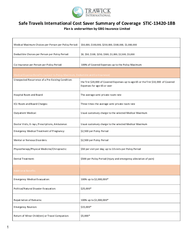 Safe Travels International Cost Saver Summary of Coverage STIC1342018B Plan is underwritten by GBG Insurance LimitedMedical Maximum Choices per Person per Policy Period:$50,000, $100,000, $250,000,