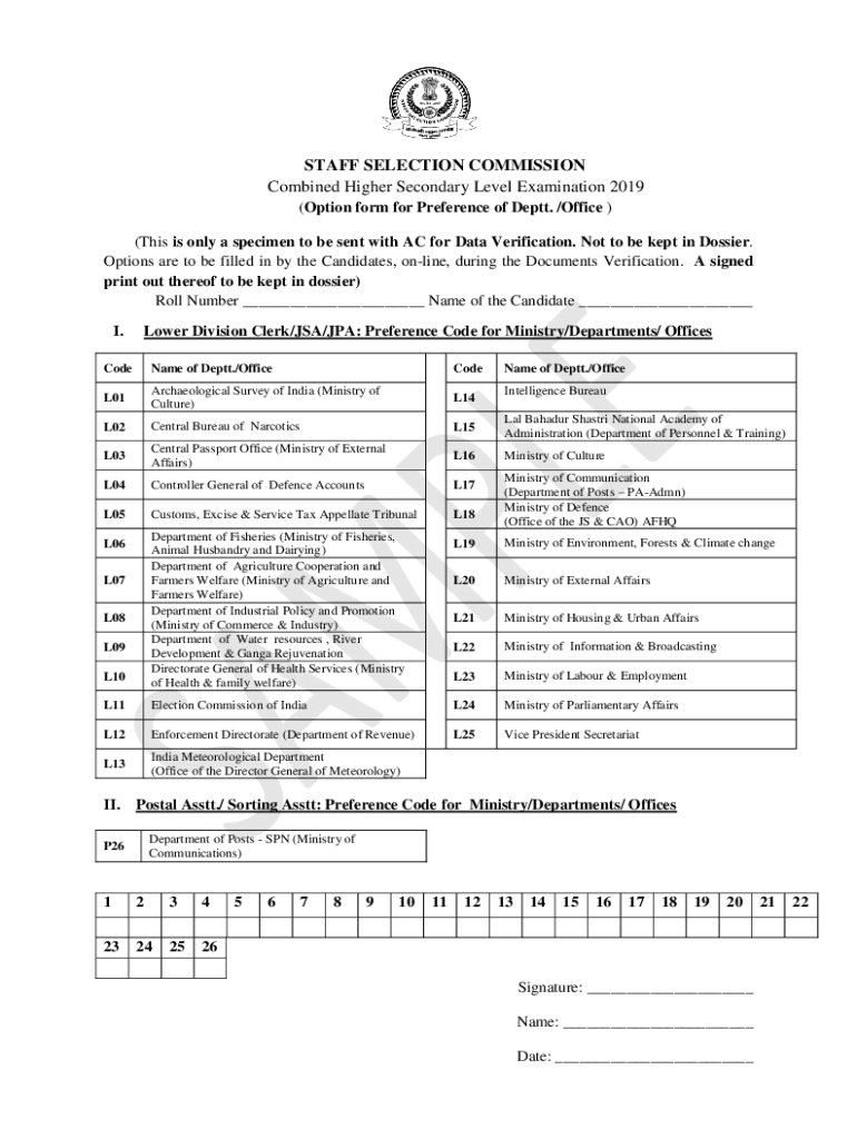 STAFF SELECTION COMMISSION Combined Higher Secondary Level Examination 2019 (Option form for Preference of Depth. /Office) (This is only a specimen to be sent with AC for Data Verification. Not to