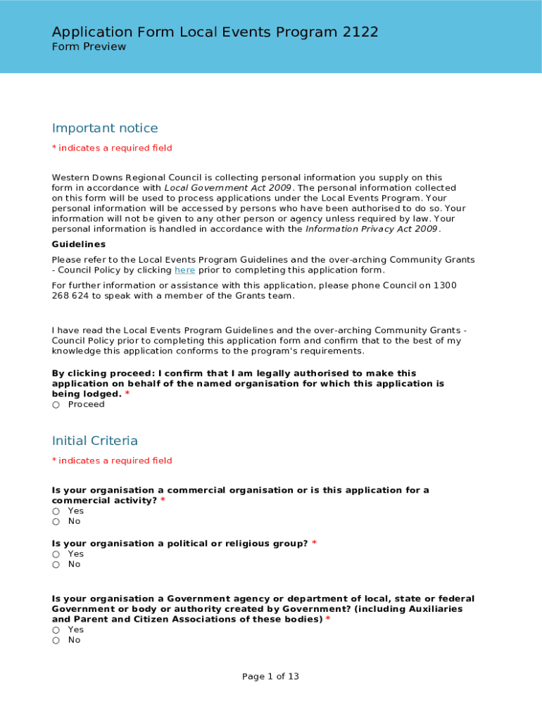 Application Form Local Events Program 2122 Form PreviewImportant notice * indicates a required ELD Western Downs Regional Council is collecting personal information you supply on this form in accordance