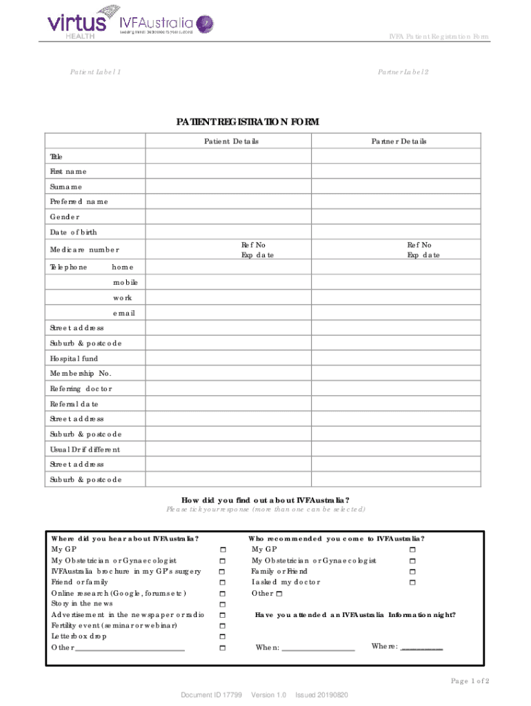 IFA Patient Registration Formation Label 1Partner Label 2PATIENT REGISTRATION FORM Patient DetailsPartner DetailsTitle First name Surname Preferred name Gender Date of birth Ref No Exp date Medicare