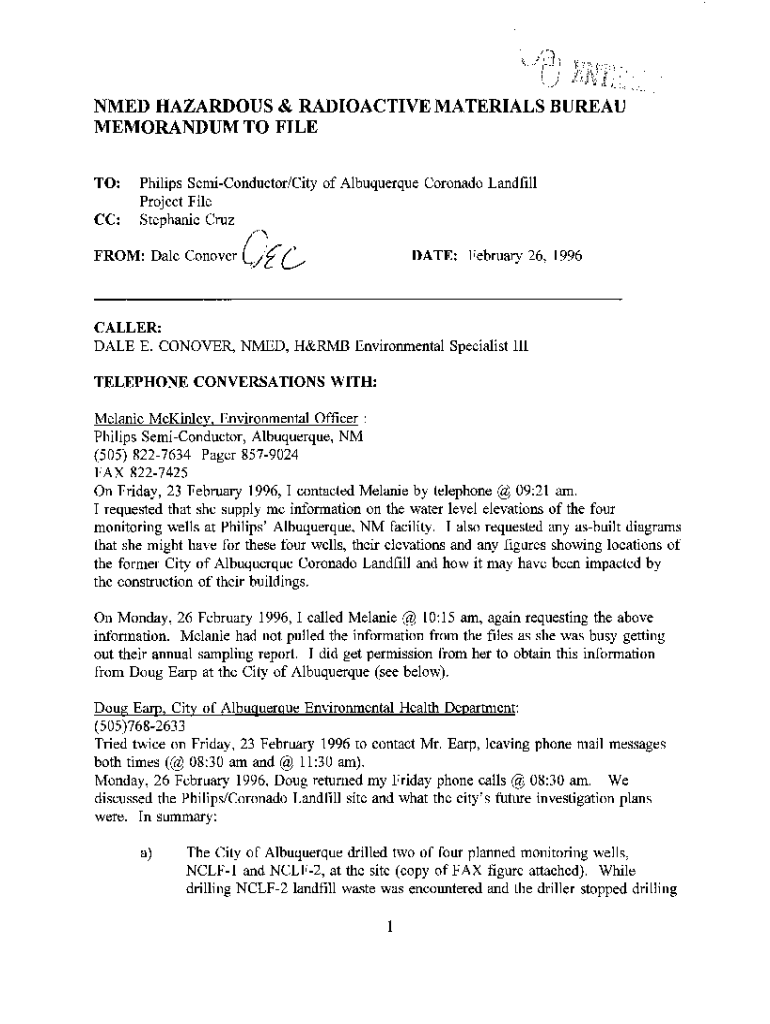 NAMED HAZARDOUS & RADIOACTIVE MATERIALS BUREAU MEMORANDUM TO FILE TO:CC:Philips Semiconductor/City of Albuquerque Coronado Landfill Project File Stephanie Cruzado: Dale Convert\'date: February 26,