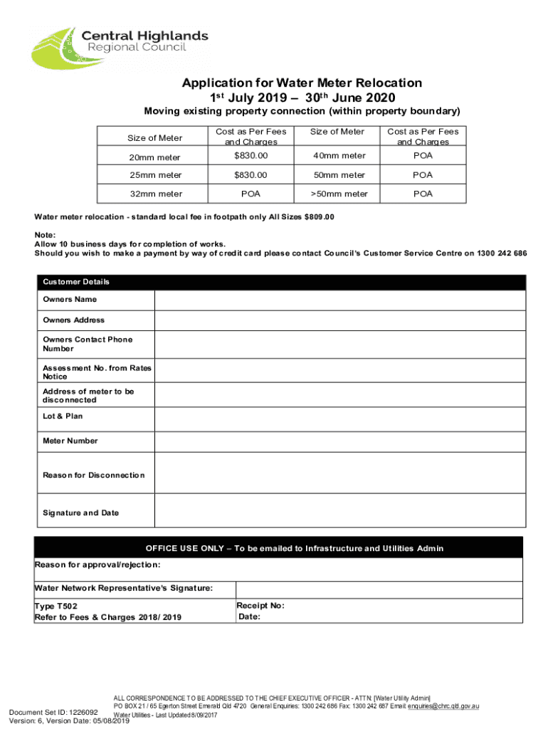 Application for Water Meter Relocation 1st July 2019 30th June 2020 Moving existing property connection (within property boundary) Size of Meters as Per Fees and ChargesSize of Meters as Per Fees