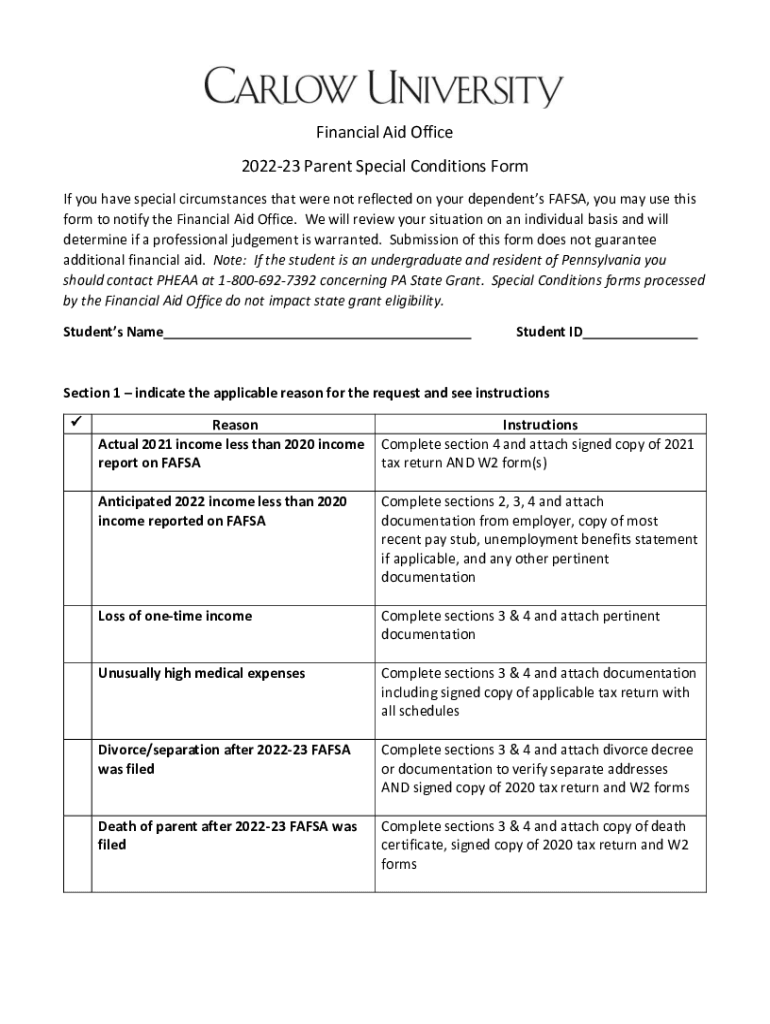 Financial Aid Office 202223 Parent Special Conditions Form If you have special circumstances that were not reflected on your dependents FAFSA, you may use this form to notify the Financial Aid Office.