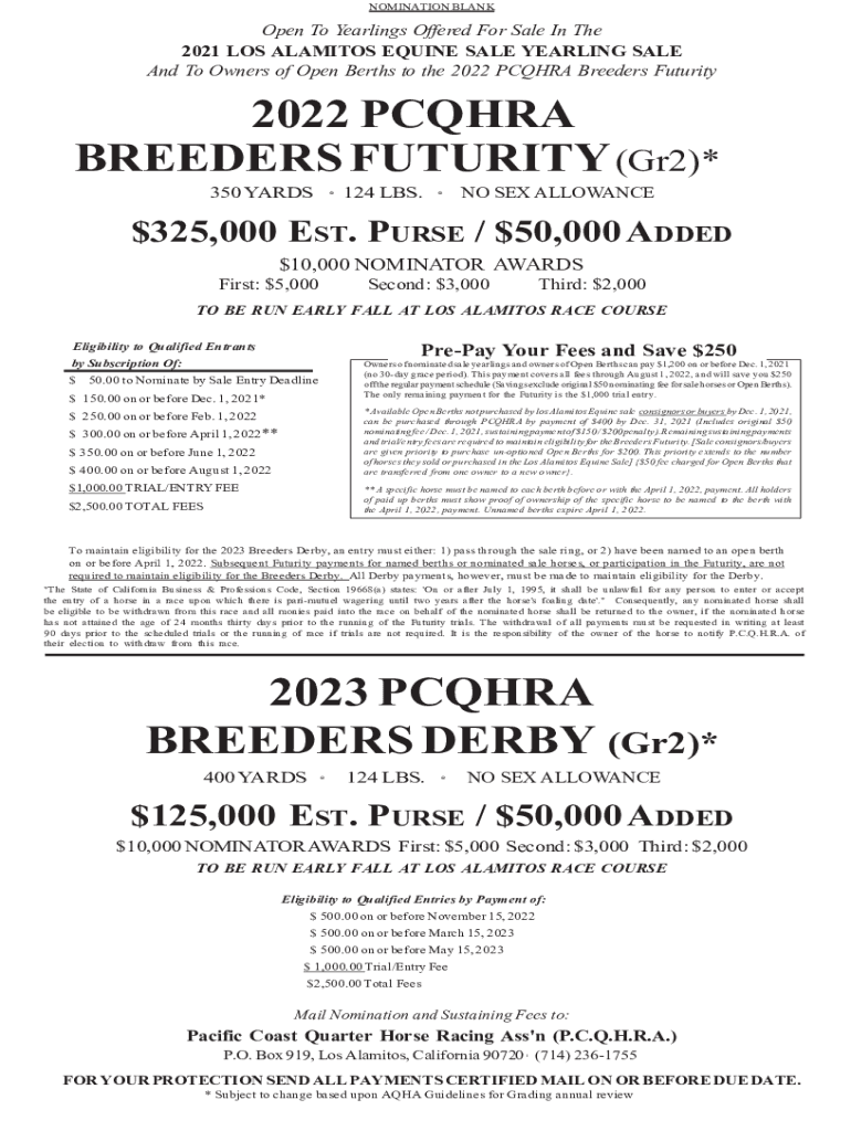 NOMINATION Blanket To Yearlings Offered For Sale In The 2021 LOS CALAMITOUS EQUINE SALE YEARLING SALE And To Owners of Open Berths to the 2022 PCHA Breeders Futurity2022 PCHA BREEDERS FUTURITY (Gr2)*
