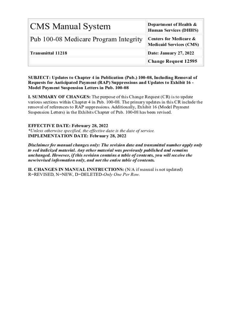 CMS Manual SystemDepartment of Health & Human Services (HHS)Pub 10008 Medicare Program IntegrityCenters for Medicare & Medicaid Services (CMS)Transmittal 11218Date: January 27, 2022Change Request