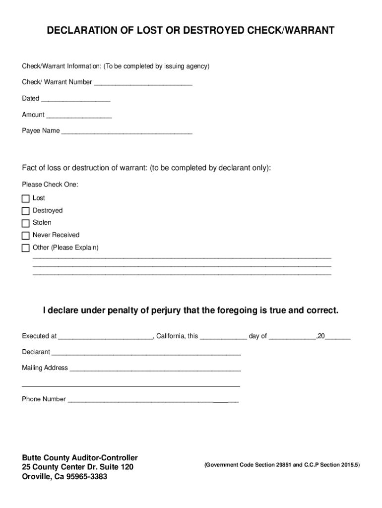 DECLARATION OF LOST OR DESTROYED CHECK/WARRANTCheck/Warrant Information: (To be completed by issuing agency) Check/ Warrant Number ___ Dated ___ Amount ___ Payee Name ___Fact of loss or destruction