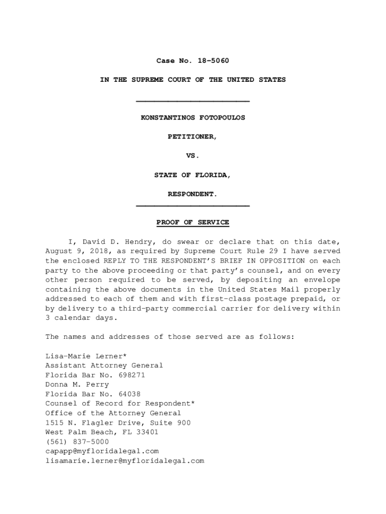Case No. 185060 IN THE SUPREME COURT OF THE UNITED STATES ___ KONSTANTINOS FOTOPOULOS PETITIONER, VS. STATE OF FLORIDA, RESPONDENT. ___ PROOF OF SERVICE I, David D. Hendry, do swear or declare that