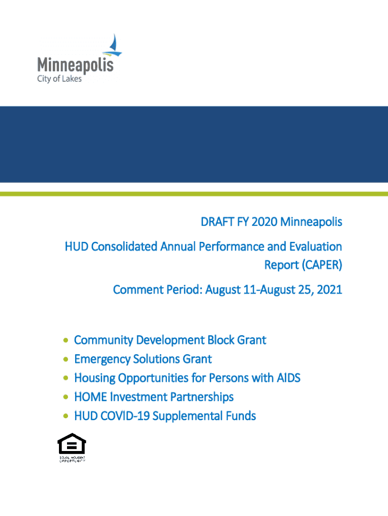 DRAFT FY 2020 Minneapolis HUD Consolidated Annual Performance and Evaluation Report (CAPER) Comment Period: August 11August 25, 2021 Community Development Block Grant Emergency Solutions Grant Housing