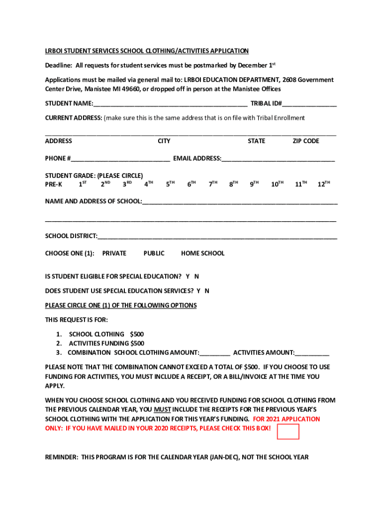 LR BOI STUDENT SERVICES SCHOOL CLOTHING/ACTIVITIES APPLICATION Deadline: All requests for student services must be postmarked by December 1st Applications must be mailed via general mail to: LR BOI