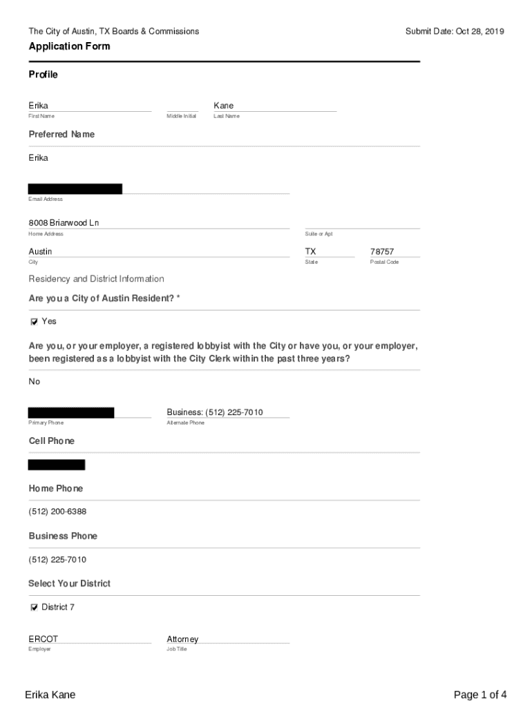 The City of Austin, TX Boards & CommissionsSubmit Date: Oct 28, 2019Application Form Profile Erika First Name Kane Middle Initially NamePreferred Name ErikaEmail Address8008 Braidwood Ln Home AddressSuite