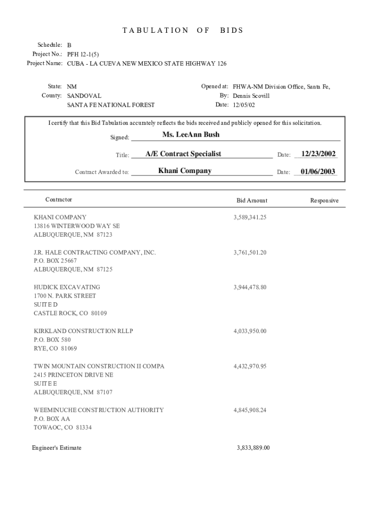 TABULATIONOFBIDSSchedule: B Project No.: pH 121(5) Project Name: CUBA LA CUE VA NEW MEXICO STATE HIGHWAY 126 State: NM County: SANDOVAL SANTA FE NATIONAL Foreshortened at: HWANG Division Office, Santa