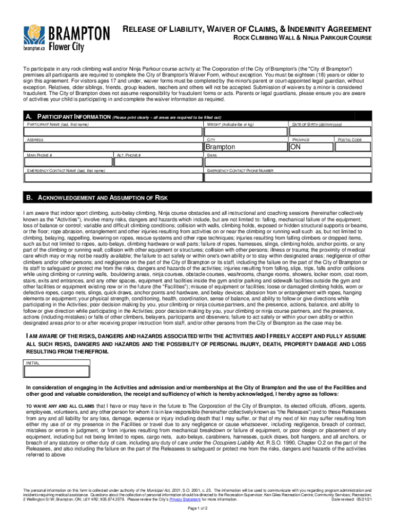 Get the free WAIVER OF LIABILITY AND RELEASE AGREEMENT ROCK CLIMBING