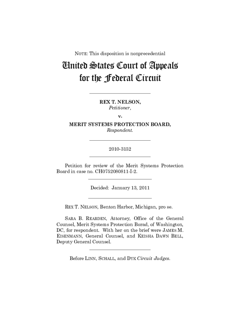 NOTE: This disposition is nonprecedentialUnited States Court of Appeals for the Federal Circuit ___ REX T. NELSON, Petitioner, v. MERIT SYSTEMS PROTECTION BOARD, Respondent. ___ 20103152 ___ Petition