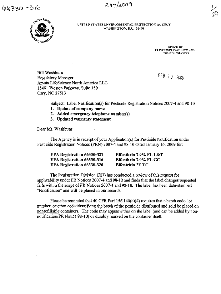 UNITED STATES ENVIRONMENTAL PROTECTION AGENCY WASHINGTON, D.C. 20460OFFICE OF Prevention\'i. PESTICIDES AND TOXIC SUBSTANCES Bill Washburn Regulatory Manager Arista Prescience North America LLC 15401
