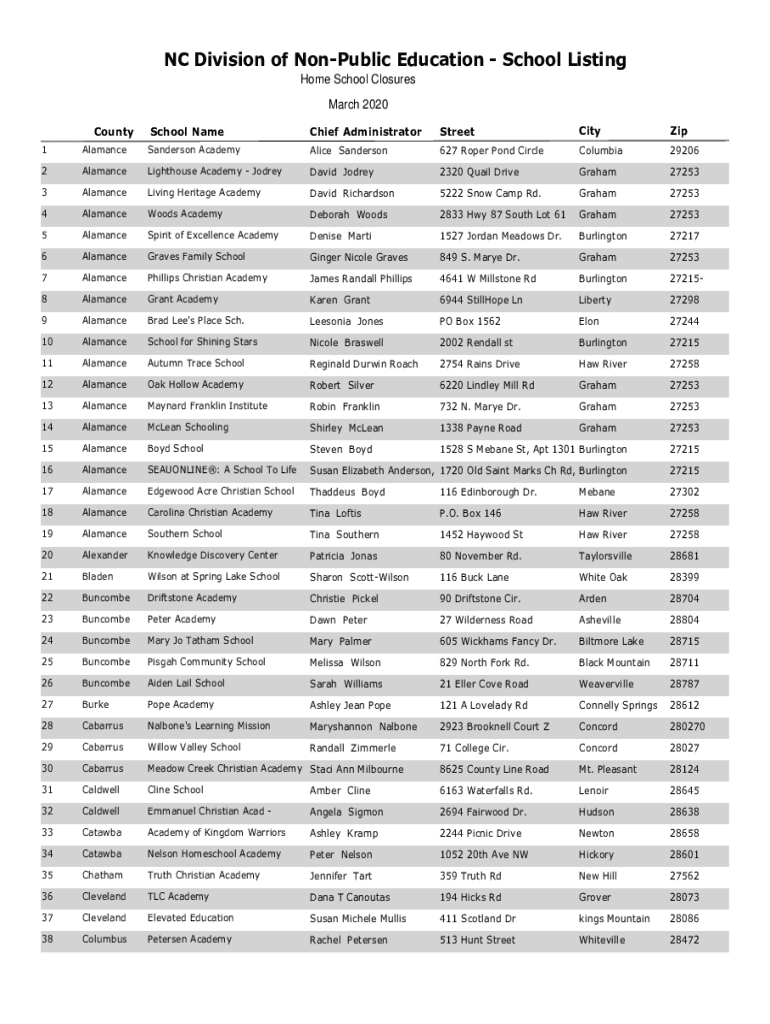 NC Division of Nonpublic Education School Listing Home School Closures March 2020 School Tallchief AdministratorStreetCityZip1AlamanceSanderson Academy Alice Sanderson627 Roper Pond CircleColumbia292062AlamanceLighthouse