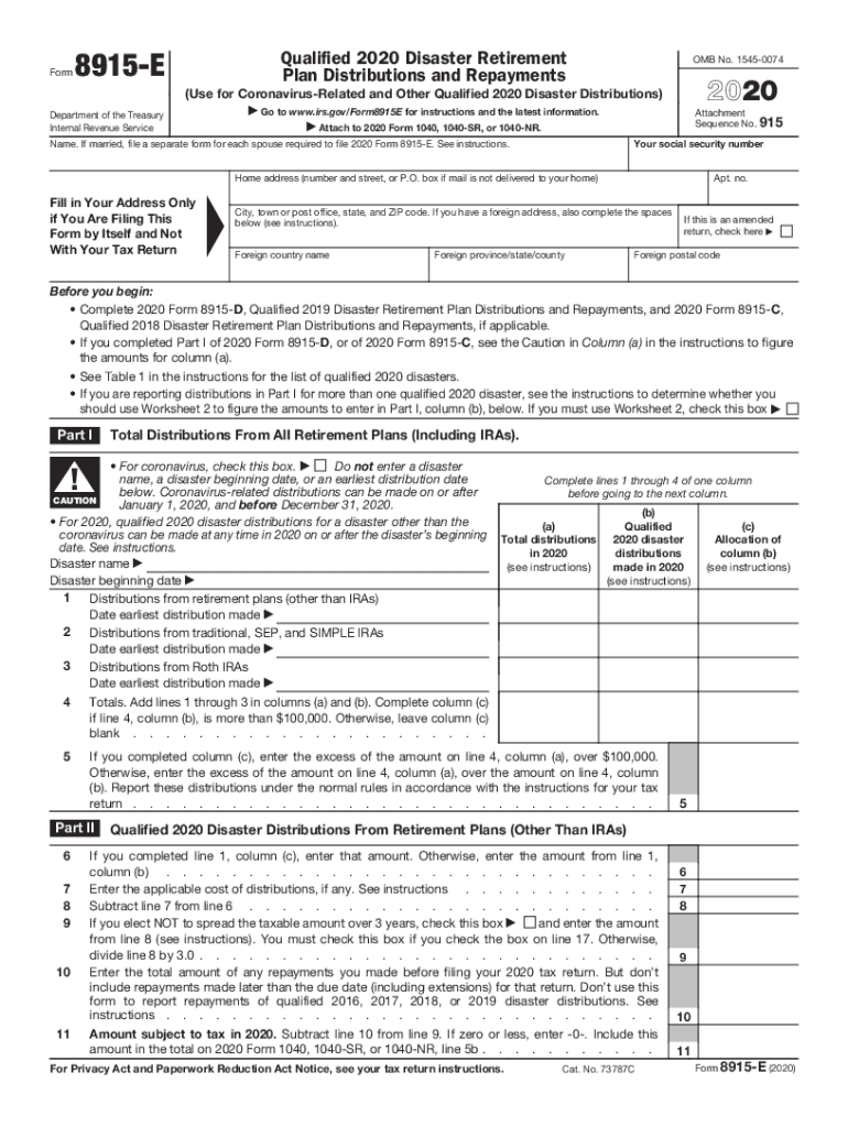 Form8915EQualified 2020 Disaster Retirement Plan Distributions and Repayments OMB No. 154500742020(Use for CoronavirusRelated and Other Qualified 2020 Disaster Distributions) a Go to www.irs.gov/Form8915E