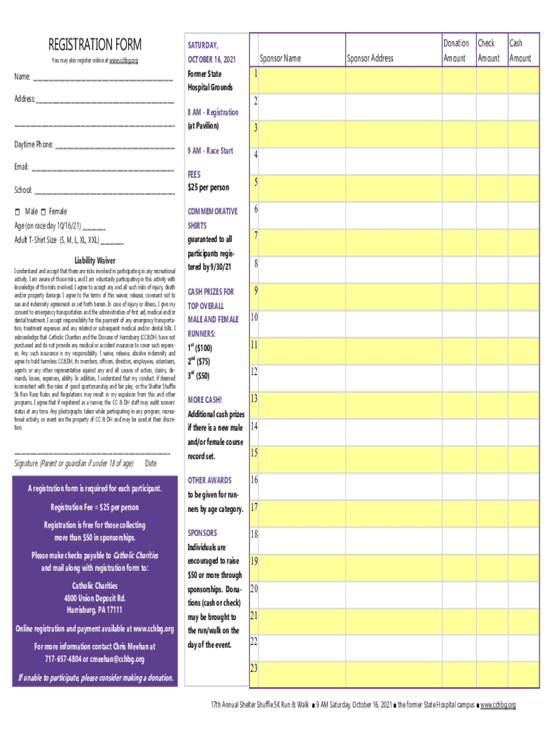 REGISTRATION FORM You may also register online at www.cchbg.orgName: ___ Address: ___ ___ Daytime Phone: ___ Email: ___ School: ___ Male Female Age (on race day 10/16/21) ___ Adult Shirt Size (S,