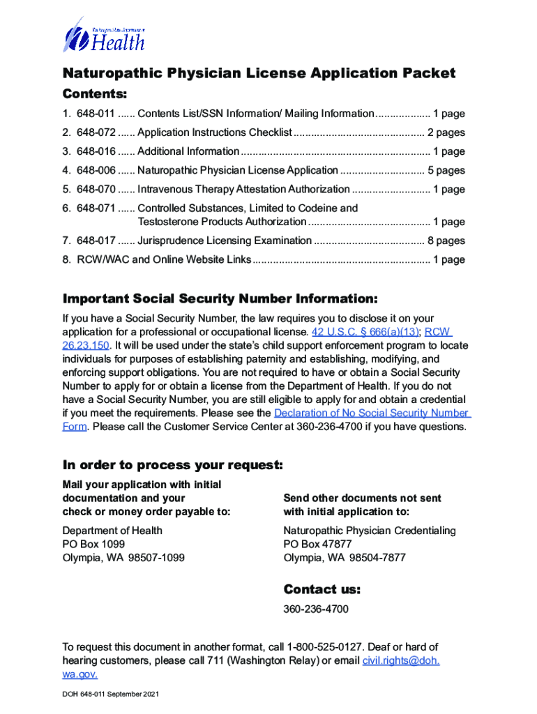 Naturopathic Physician License Application Packet Contents: 1. 648011....... Contents List/SSN Information/ Mailing Information.................... 1 page 2. 648072....... Application Instructions