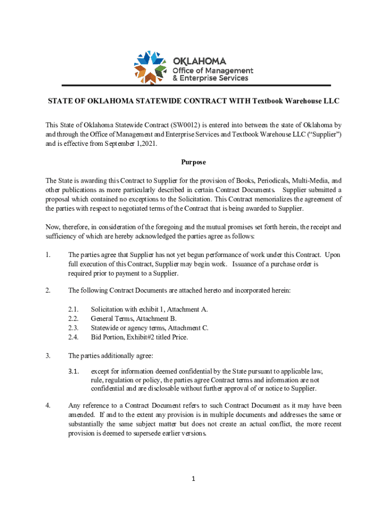 STATE OF OKLAHOMA STATEWIDE CONTRACT WITH Textbook Warehouse LLC This State of Oklahoma Statewide Contract (SW0012) is entered into between the state of Oklahoma by and through the Office of Management