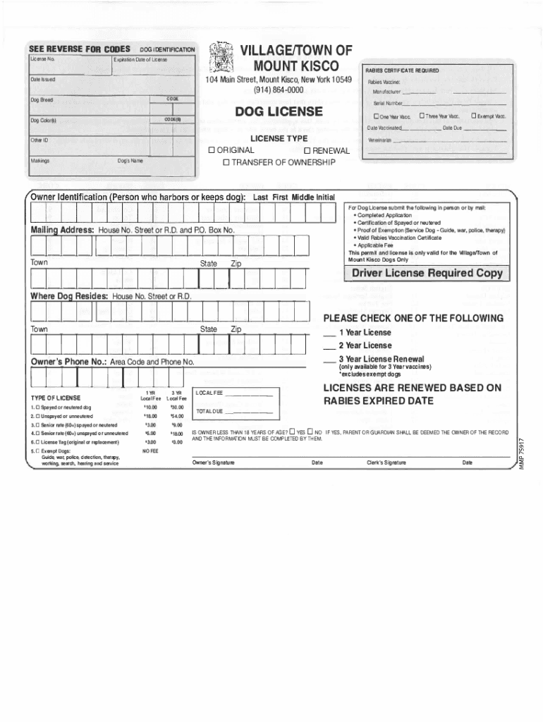 SEE REVERSE FOR CODES License No.IDATE IssuedVILLAGE/TOWN OF MOUNT DISCOLOR IDENTIFICATIONExpiration Date of License104 Main Street, Mount Disco, New York 10549 (914) 8640000Dog BreedCOOEDog Color(s)DOG