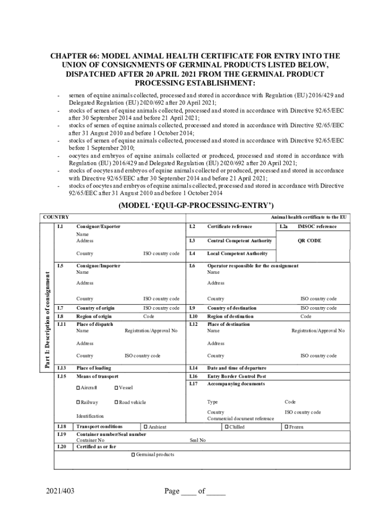 CHAPTER 66: MODEL ANIMAL HEALTH CERTIFICATE FOR ENTRY INTO THE UNION OF CONSIGNMENTS OF GERMINAL PRODUCTS LISTED BELOW, DISPATCHED AFTER 20 APRIL 2021 FROM THE GERMINAL PRODUCT PROCESSING ESTABLISHMENT: