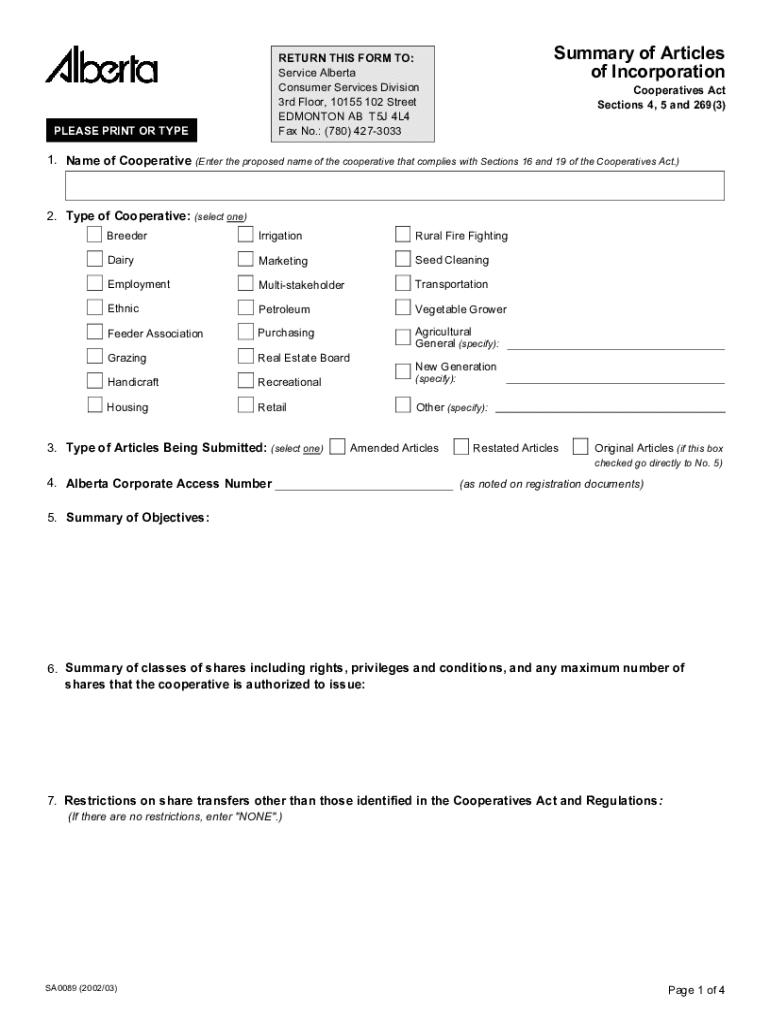 Summary of Articles of IncorporationRETURN THIS FORM TO: Service Alberta Consumer Services Division 3rd Floor, 10155 102 Street EDMONTON AB T5J 4L4 Fax No.: (780) 4273033PLEASE PRINT OR TYPECooperatives