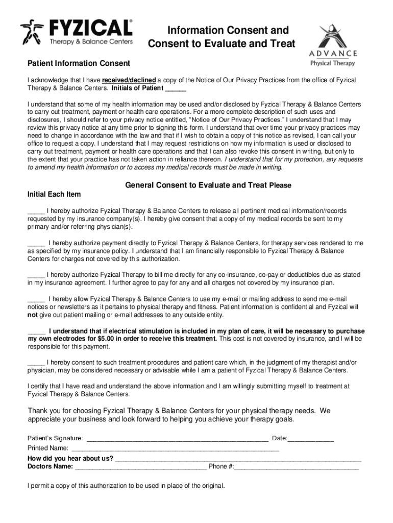 Information Consent and Consent to Evaluate and Treat Patient Information Consent I acknowledge that I have received/declined a copy of the Notice of Our Privacy Practices from the office of Typical