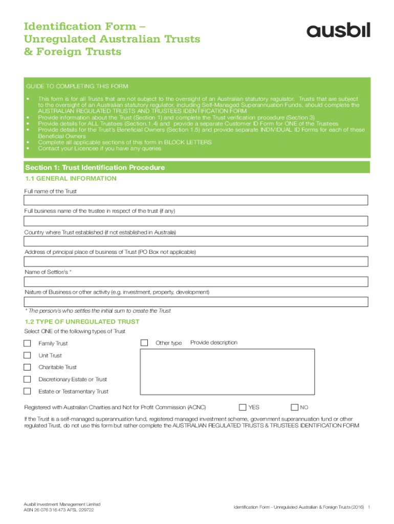 Identification Form Unregulated Australian Trusts & Foreign Trusts GUIDE TO COMPLETING THIS FORM is for all Trusts that are not subject to the oversight of an Australian statutory regulator. Trusts