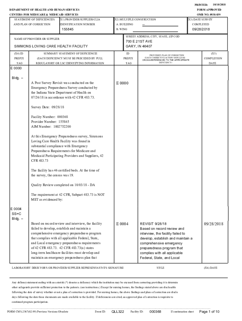 10/10/2018PRINTED: DEPARTMENT OF HEALTH AND HUMAN SERVICESFORM APPROVEDCENTERS FOR MEDICARE & MEDICAID SERVICES STATEMENT OF DEFICIENCIES(X1) PROVIDER/SUPPLIER/LIGAND PLAN OF CORRECTIONIDENTIFICATION