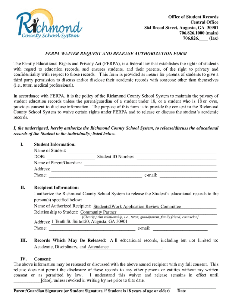 Office of Student Records Central Office 864 Broad Street, Augusta, GA 30901 706.826.1000 (main) 706.826.___ (fax) FER PA WAIVER REQUEST AND RELEASE AUTHORIZATION FORM The Family Educational Rights