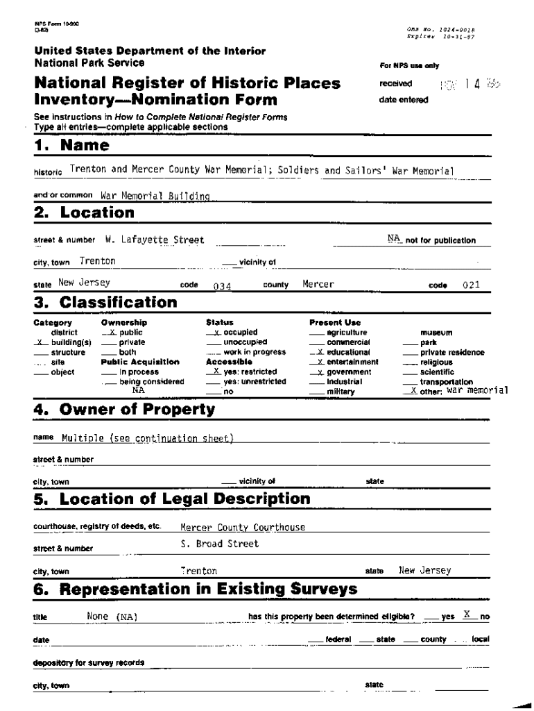 NPS Form 10900 (382)OMB No. 10240018 Expires 103187United States Department of the International Park ServiceNow NPS use onlyNational Register off Historic Places InventoryNomination FormreceivedKjpyI