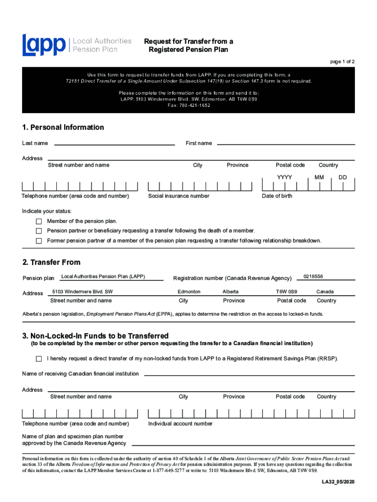 Request for Transfer from a Registered Pension Plan page 1 of 2 Use this form to request to transfer funds from LAPP. If you are completing this form, a T2151 Direct Transfer of a Single Amount Under