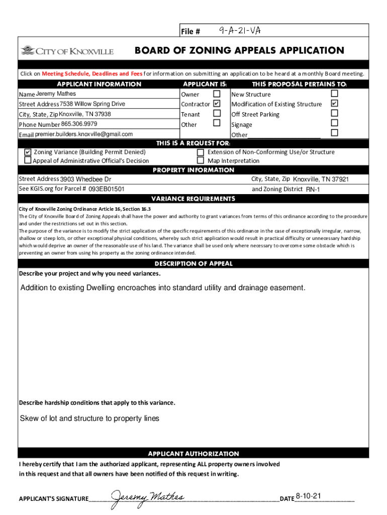 File #BOARD OF ZONING APPEALS APPLICATION Click on Meeting Schedule, Deadlines and Fees for information on submitting an application to be heard at a monthly Board meeting. APPLICANT INFORMATION Name