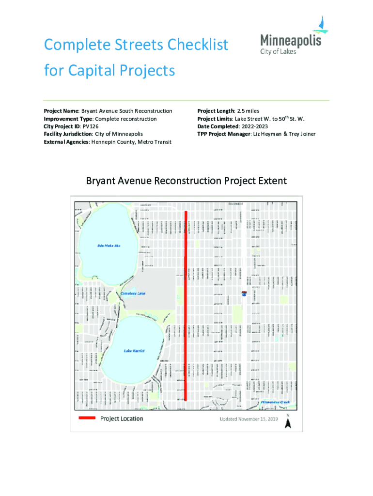 Complete Streets Checklist for Capital Projects Project Name: Bryant Avenue South Reconstruction Improvement Type: Complete reconstruction City Project ID: PV126 Facility Jurisdiction: City of Minneapolis