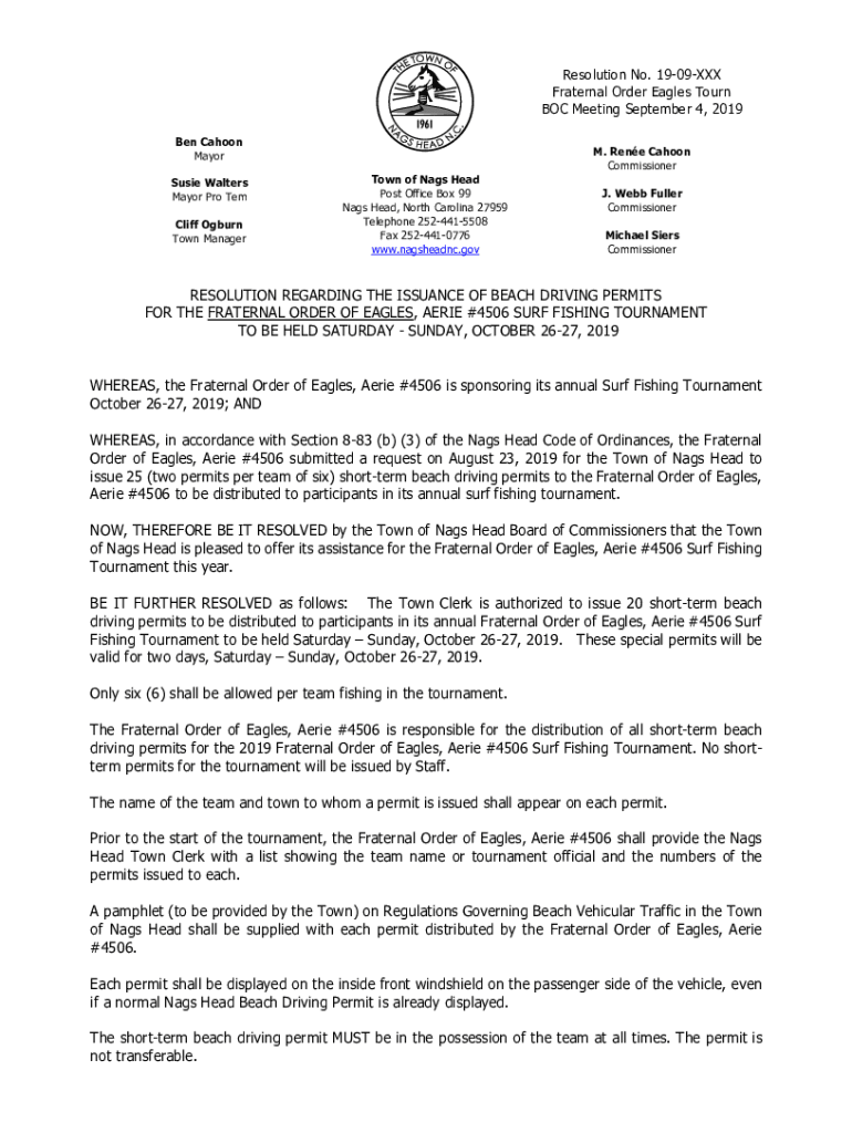 Resolution No. 1909XXX Fraternal Order Eagles Tour BOC Meeting September 4, 2019, Ben Cahoot Mayor Susie Walters Mayor Pro Tem Cliff Burn Town ManagerTown of Nags Head Post Office Box 99 Nags Head,