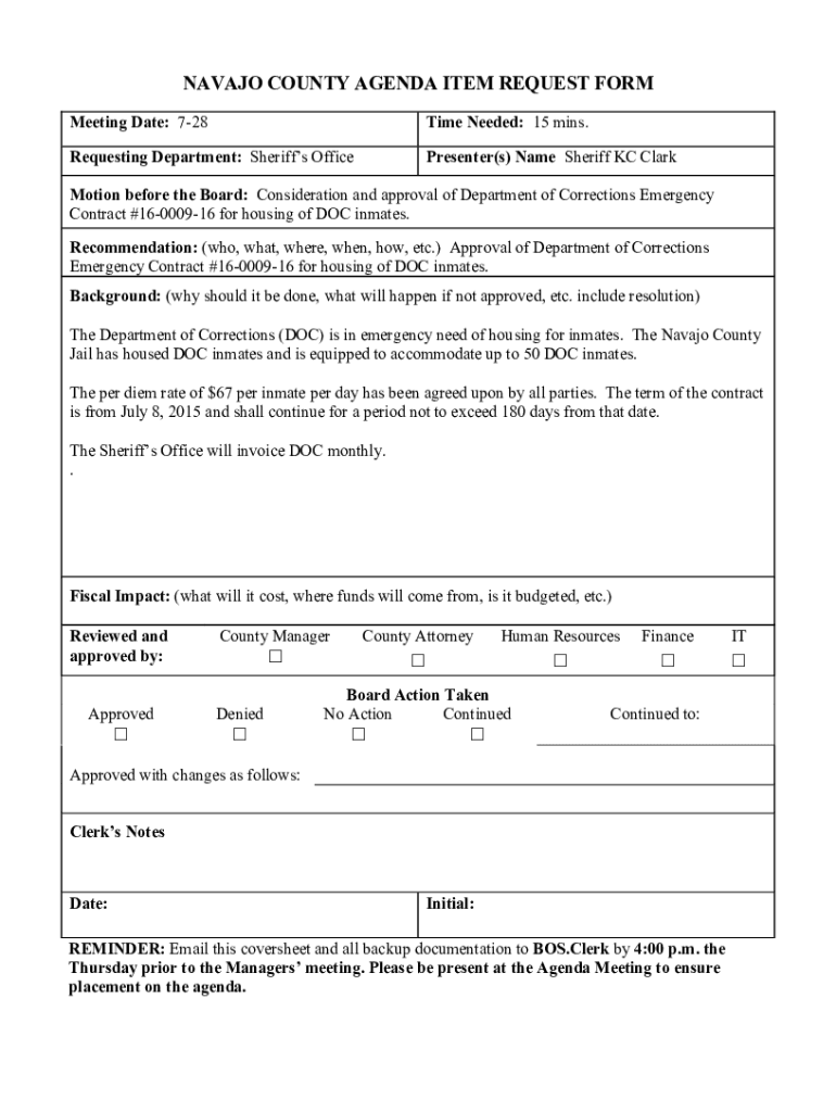 NAVAJO COUNTY AGENDA ITEM REQUEST FORM Meeting Date: 728Time Needed: 15 mins. Requesting Department: Sheriffs OfficePresenter(s) Name Sheriff KC Claymation before the Board: Consideration and approval