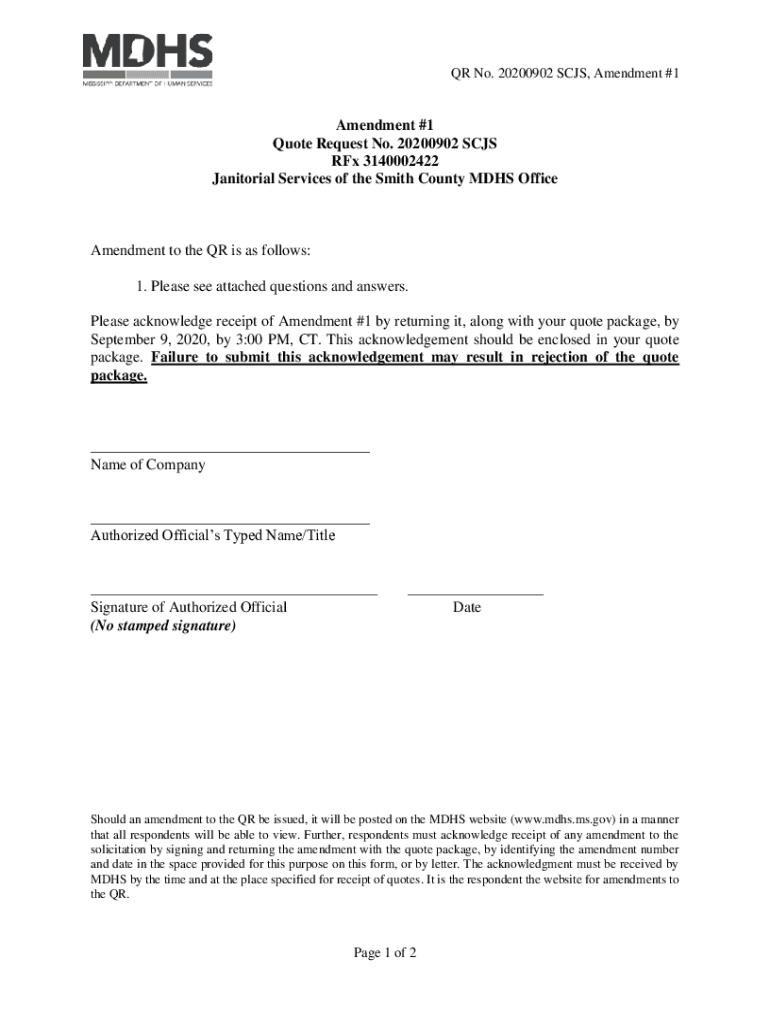 QR No. 20200902 SCS, Amendment #1Amendment #1 Quote Request No. 20200902 SCS Rex 3140002422 Janitorial Services of the Smith County MDS OfficeAmendment to the QR is as follows: 1. Please see attached
