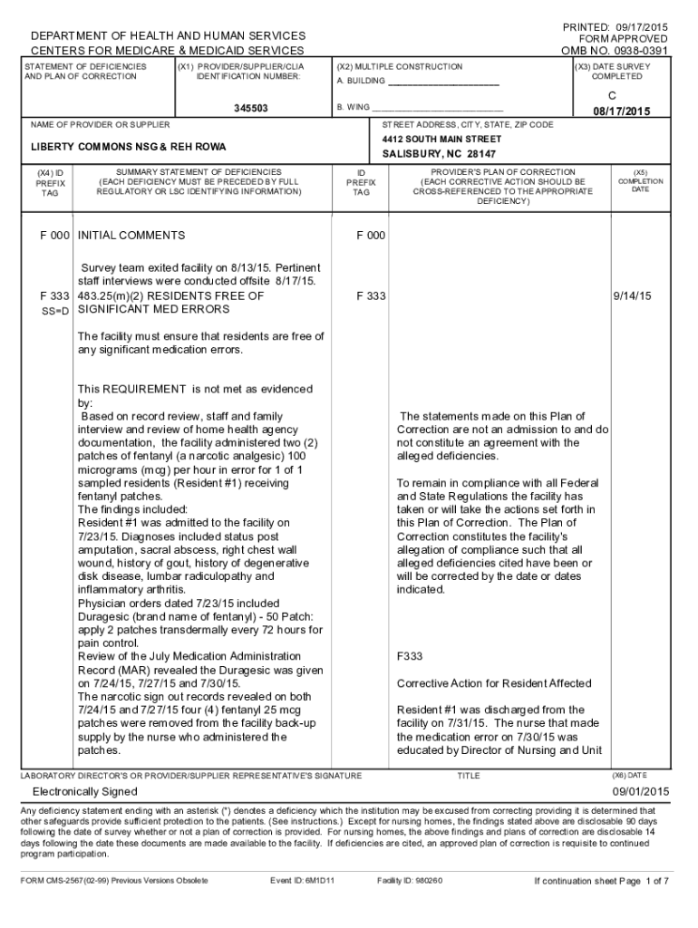 PRINTED: 09/17/2015 FORM APPROVEDDEPARTMENT OF HEALTH AND HUMAN SERVICES CENTERS FOR MEDICARE & MEDICAID SERVICES STATEMENT OF DEFICIENCIES AND PLAN OF CORRECTION(X1) PROVIDER/SUPPLIER/CIA IDENTIFICATION