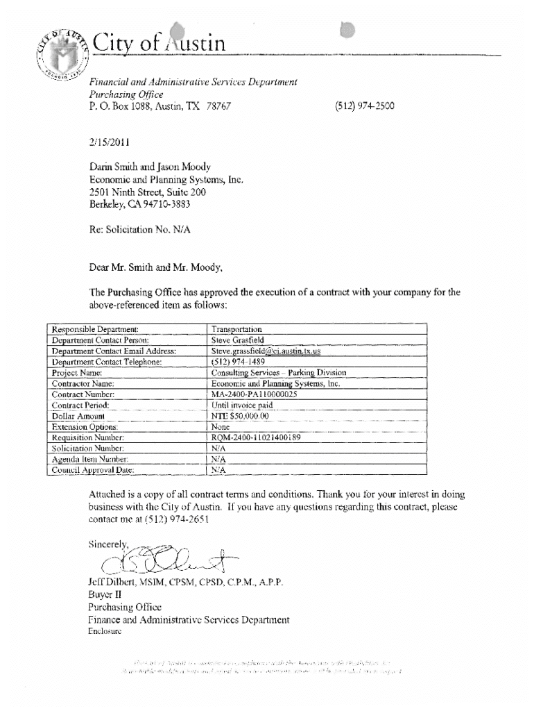 Financial and Administrative Services Department Purchasing Office P. 0. Box 1088, Austin, TX 78767(512) 97425002/15/2011Darin Smith and Jason Moody Economic and Planning Systems, Inc. 2501 Ninth