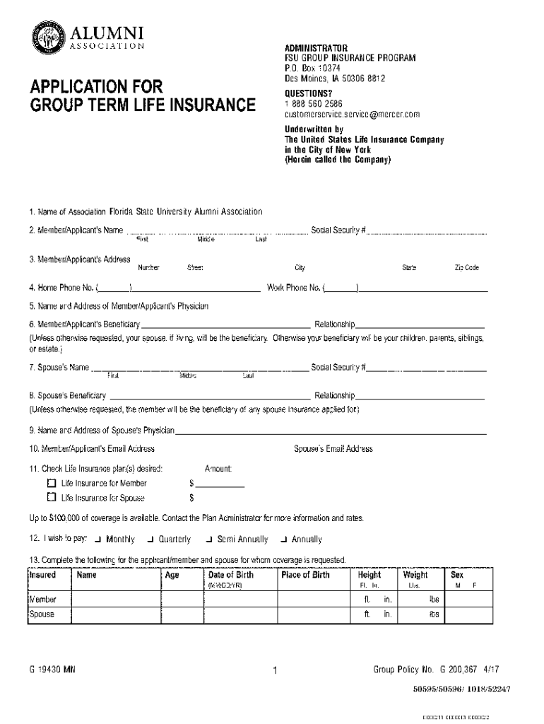 ADMINISTRATOR FSU GROUP INSURANCE PROGRAM P.O. Box 10374 Des Moines, IA 503068812 QUESTIONS? 18885602586 customer service. Service@mercer.com Underwritten by The United States Life Insurance Company
