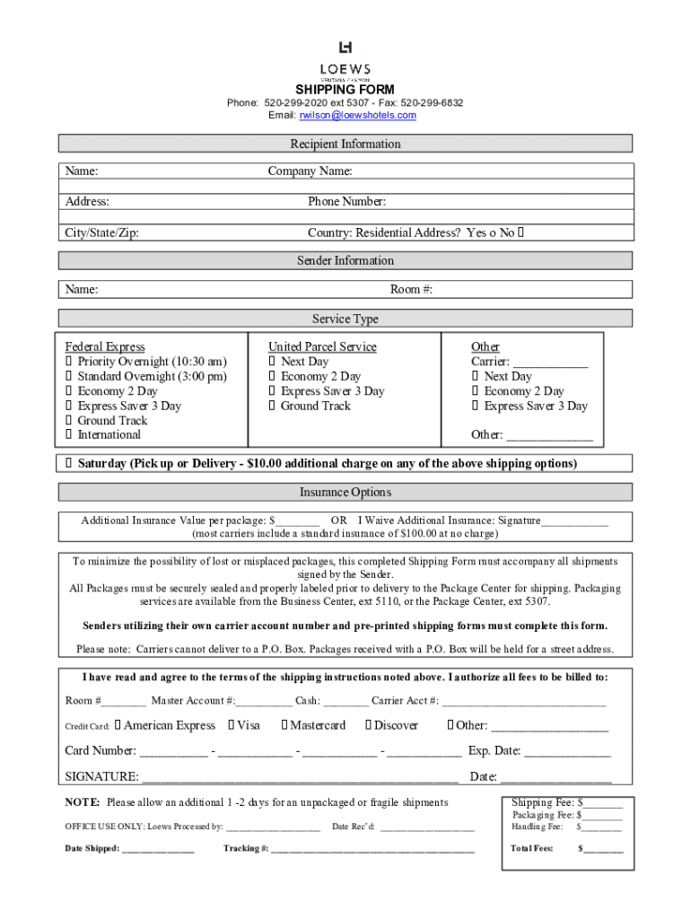 SHIPPING FORM Phone: 5202992020 ext 5307 Fax: 5202996832 Email: Wilson×loewshotels.recipient Information Name:Company Name:Address:Phone Number:City/State/Zip:Country: Residential Address? Yes No