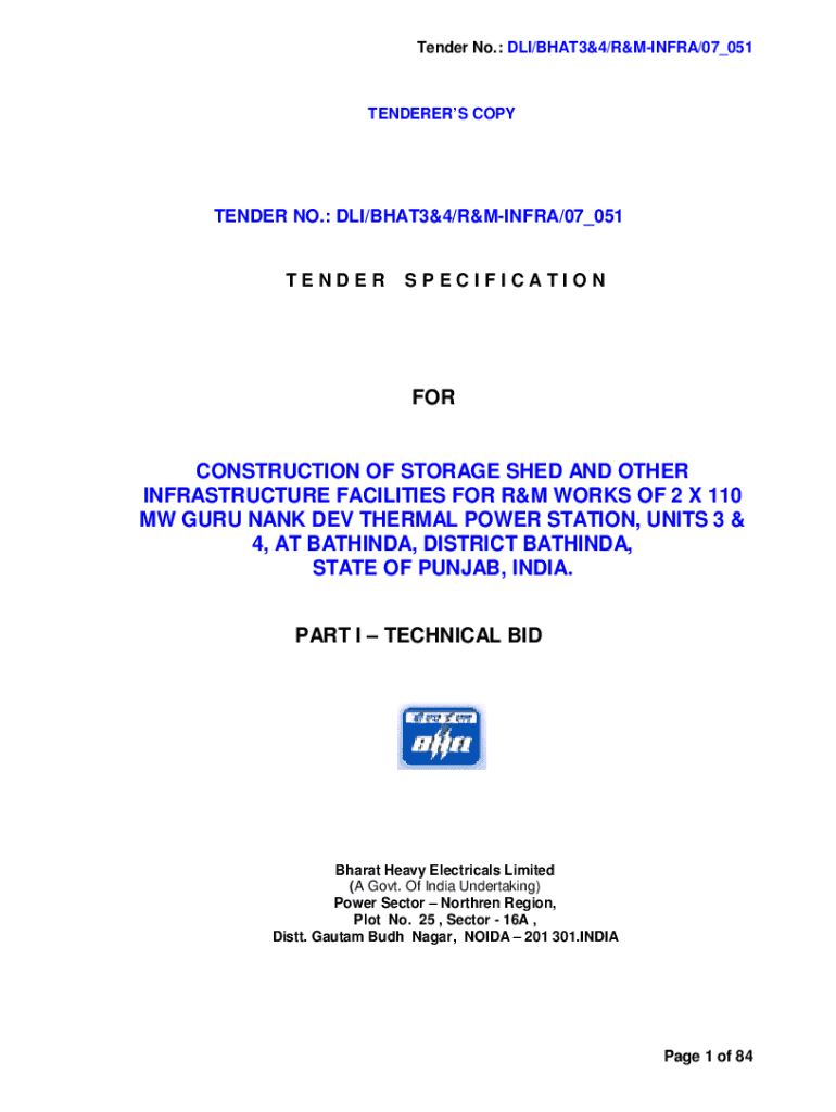 Tender No.: DLI/BHAT3&4/INFRA/07×051TENDERERS CONTENDER NO.: DLI/BHAT3&4/INFRA/07×051 TENDERSPECIFICATIONFOR CONSTRUCTION OF STORAGE SHED AND OTHER INFRASTRUCTURE FACILITIES FOR R&M WORKS OF 2 ×