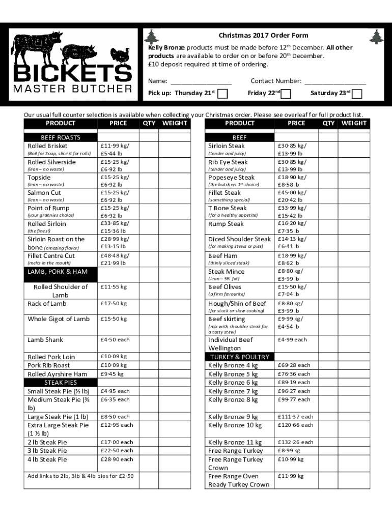 Christmas 2017 Order Form Kelly Bronze products must be made before 12th December. All other products are available to order on or before 20th December. 10 deposits required at time of ordering. Name: