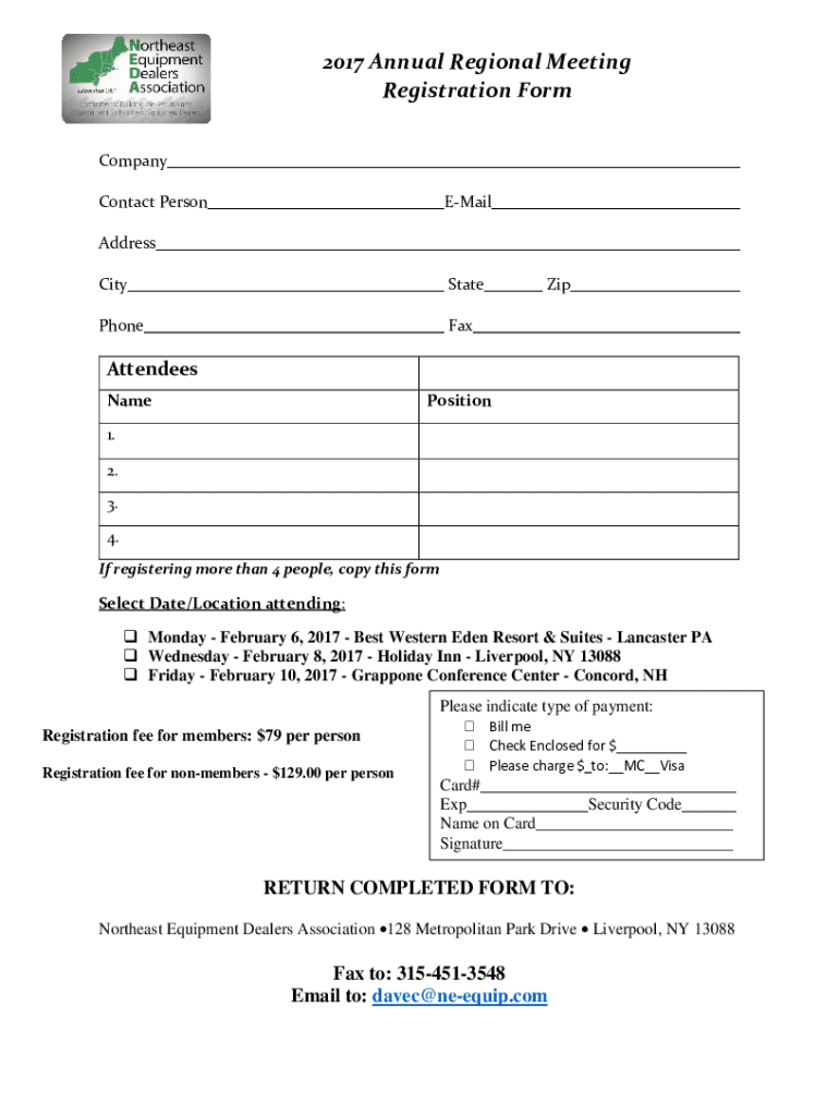 2017 Annual Regional Meeting Registration Form Company Contact PersonEMailAddress CityStatePhoneFaxZipAttendees NamePosition1. 2. 3. 4. If registering more than 4 people, copy this preselects Date/Location