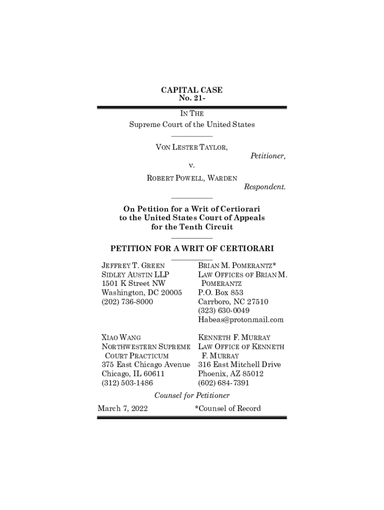 CAPITAL CASE No. 21IN THE Supreme Court of the United States ___ ON LESTER TAYLOR, v. ROBERT POWELL, WARDEN ___Petitioner, Respondent. On Petition for a Writ of Certiorari to the United States Court