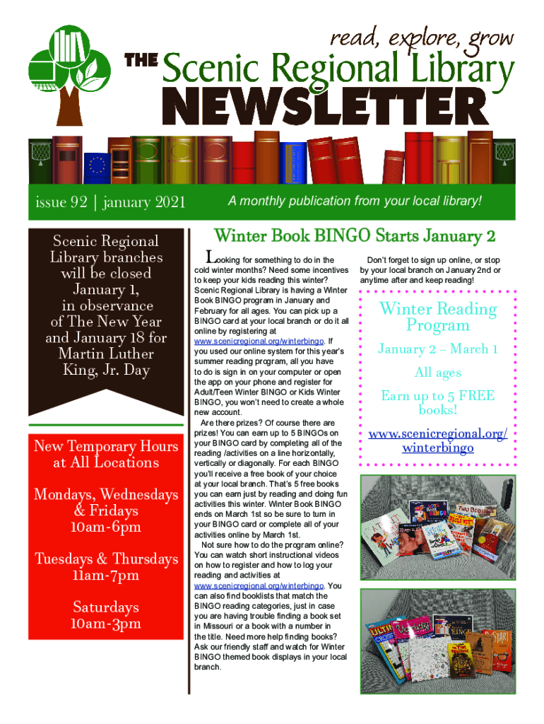 Issue 92 | January 2021 Scenic Regional Library branches will be closed January 1, in observance of The New Year and January 18 for Martin Luther King, Jr. Wayne Temporary Hours at All Locations Mondays,
