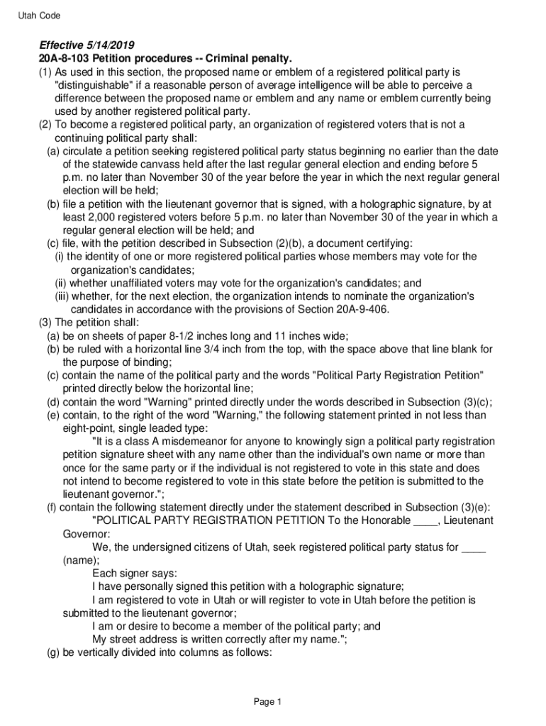 Utah Noneffective 5/14/2019 20A8103 Petition procedures Criminal penalty. (1) As used in this section, the proposed name or emblem of a registered political party is \” distinguishable\” if a