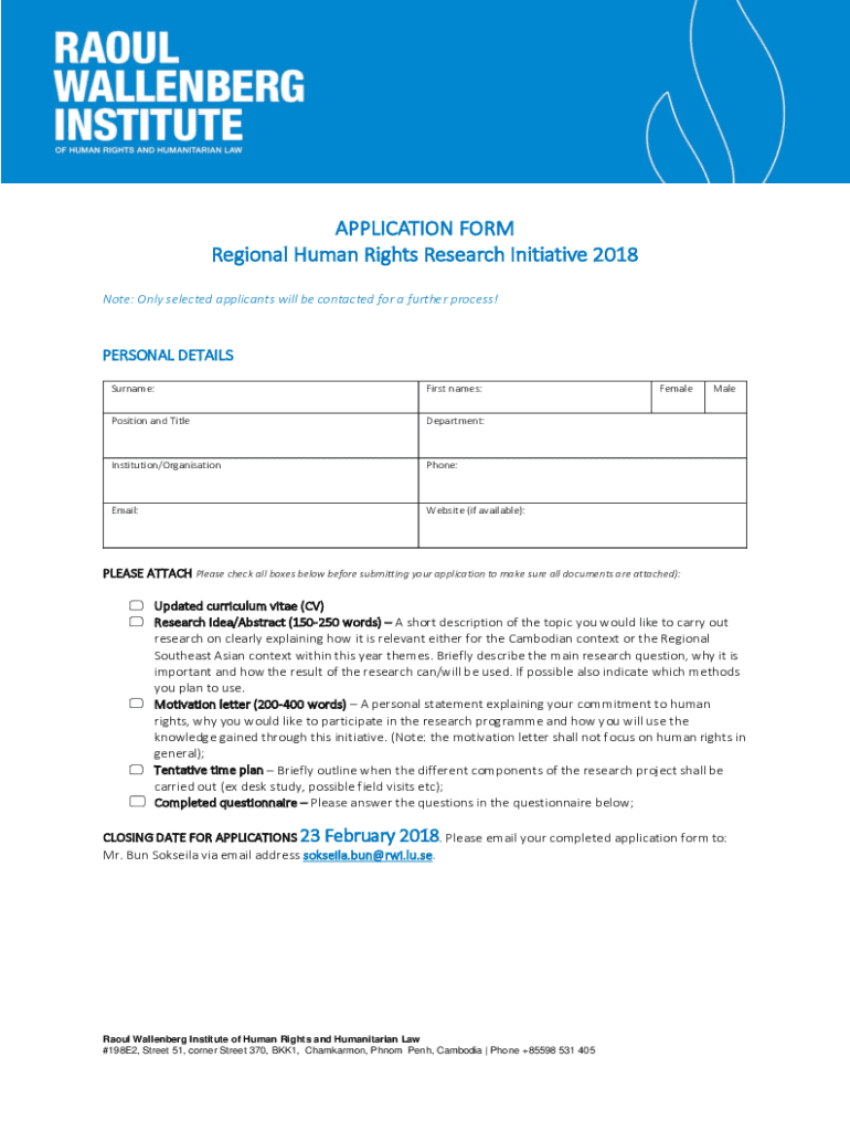 APPLICATION FORM Regional Human Rights Research Initiative 2018 Note: Only selected applicants will be contacted for a further process!PERSONAL DETAILS Surname:First names:Position and TitleDepartment:Institution/OrganisationPhone:Email:Website