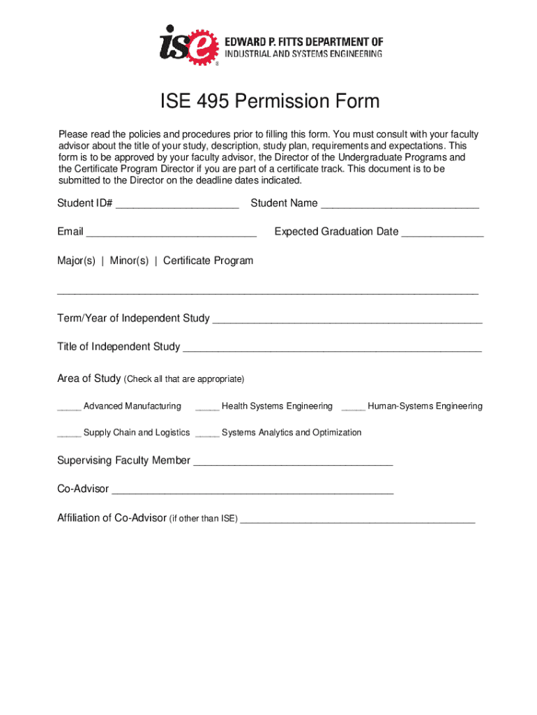 Yd\”/\'l_ EDWARD P. FITS DEPARTMENT OF INDUSTRIAL AND SYSTEMS ENGINEERING 495 Permission Form Please read the policies and procedures prior to filling this form. You must consult with your faculty